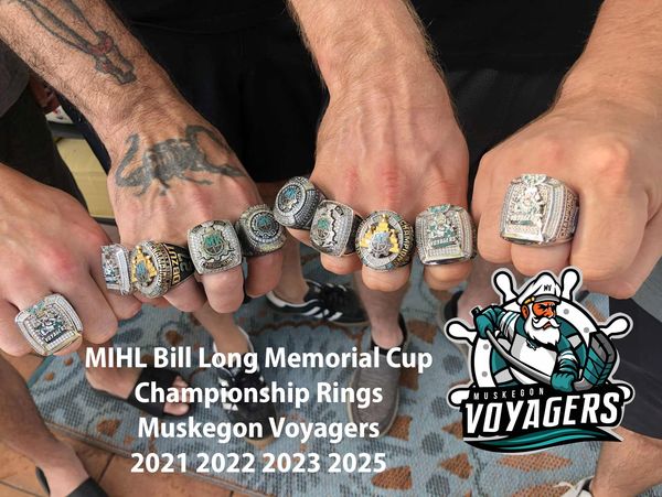 First photo is the new 2025 Ring. Second photo is Harley Obzut and Jordan Truxton wearing Four MIHL Muskegon Voyagers Championship Rings for 2021 2022 2023 and 2025. That is a whole lot of hardware bling.