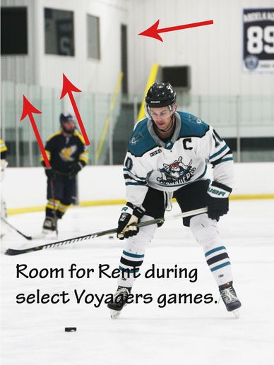 The upstairs room on the north end of the rink (arrows show location of the room) is available at select games for $375 for 20 people, $8 additional per person above 20 people up to 50 people. This includes game admission, pizza, water, and soda for the group and a PA announcement of your group. And you can watch the game from the windows. The room has HEAT and you can stay warm watching from the windows.